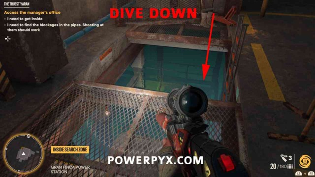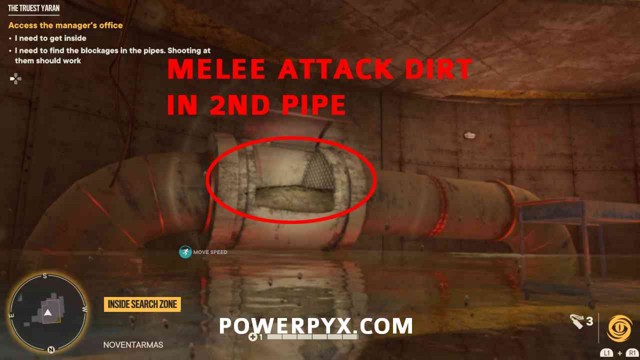 第 3 步:在同一个房间的楼下,您可以下降到水淹区。潜入水中寻找带有污垢的管道。您必须对管道中的污垢进行近战攻击才能将其清除。这将迅速排出水。请参阅下面第二张和第三张图片中红色圈出的管道。