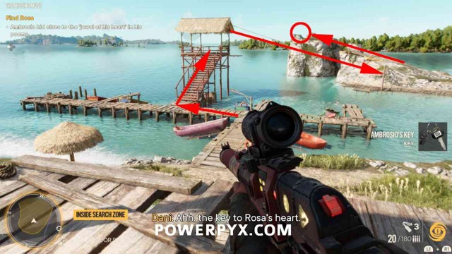 第 2 步:上楼梯到水边的瞭望点,那里有船桥。在瞭望点的顶部,您可以找到一个可选的注释。然后使用滑索到达悬崖。在悬崖顶部,您可以找到另一张纸条,提示您在水下寻找宝藏。下图显示了带有红色箭头的路径。
