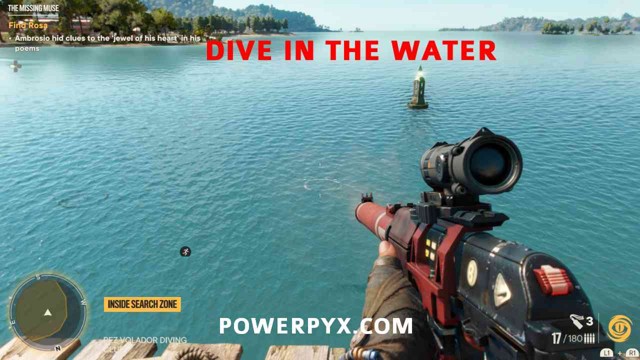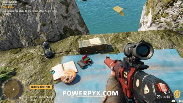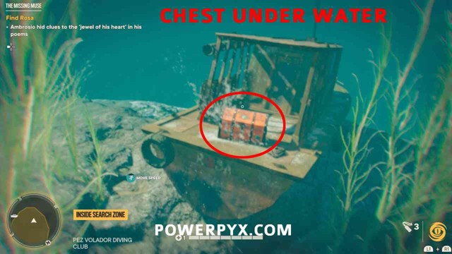 第 3 步:从你在悬崖上找到纸条的地方跳下水。潜入水下,在黄色搜索区域的边缘找到一艘沉船。如果您在步骤 1 中捡到了钥匙,您现在可以打开这个宝箱,完成寻宝任务。