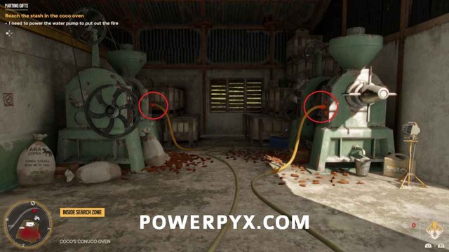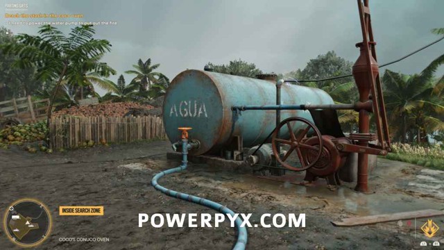 转到蓝色水泵并转动阀门以扑灭可可烤箱中的火,然后进入烤箱并通过风扇查看屋顶舱口上的锁。射它。