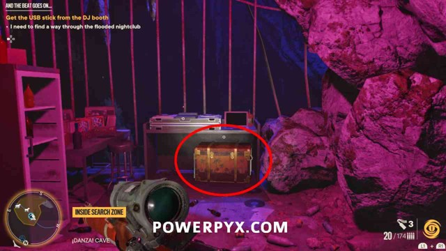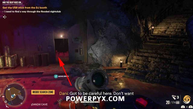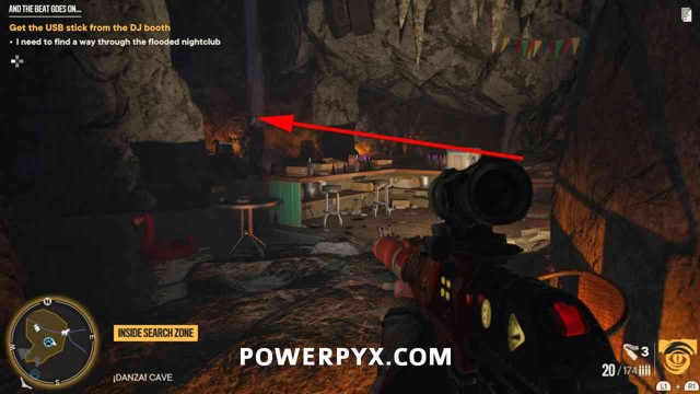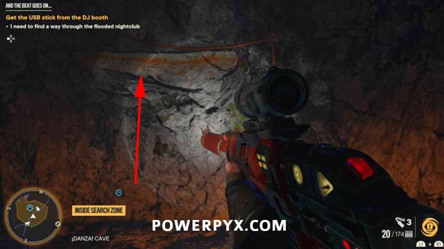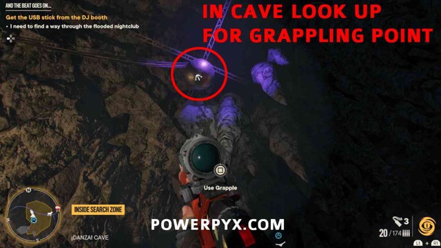 步骤1:摧毁宝藏起始音符右侧的木板。然后前往洞穴内的夜总会区。抬头看天花板,找到一个带有抓钩点的迪斯科球(下图 2,红色圈出)。抓住那里,然后用开关摆动到平台。