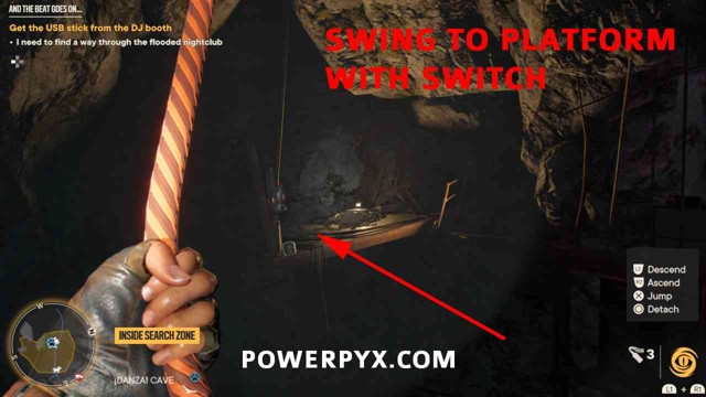 第 5 步:在顶部您会发现一个新的抓钩点。用它下降并摆动到岩石上,不要掉入水中。