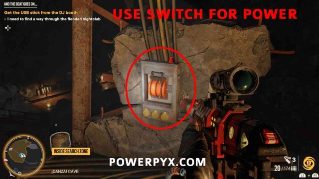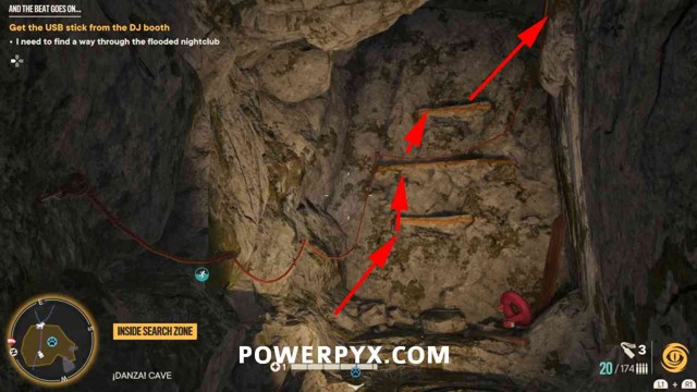 第6步:上右边的楼梯,爬上蓝色布所在的位置。然后寻找另一个抓斗点。这是您需要进行的最后一次跳跃,但是您和另一侧之间有一个瀑布,每隔几秒钟就会触电。您需要在通电时跳下,然后当您摆动穿过瀑布时,电应该再次关闭,您可以安全地越过。在另一侧,您会找到 USB 歌曲收藏品和一个装有 1911 手枪的箱子。