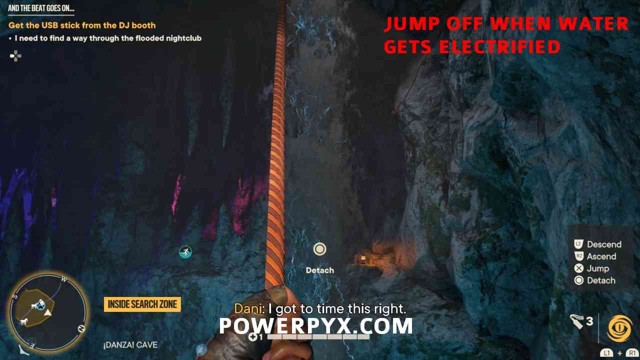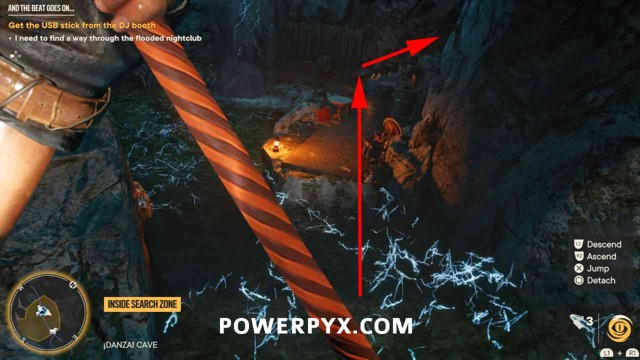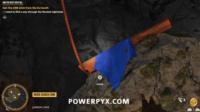 第 3 步:现在夜总会上锁的门将打开。通过它但注意不要踏入带电的水中。爬上下一个洞穴部分的黄色壁架。在上壁架的尽头,您需要向后和上方看一个带有蓝色布的壁架,您可以跳上去(下图 3)。