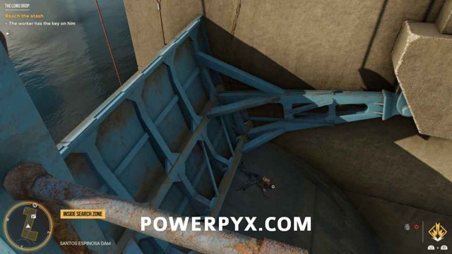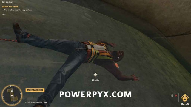 完成此操作后,大坝将打开,您将能够抓住钥匙。走到外面并使用大坝桥上的抓钩点,然后下降到卡在大坝上的工人的身体。抓住他的钥匙并重新抓起。