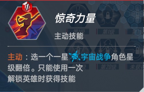 主动技能,消耗1颗宝石。选择一个一星宇宙战争角色星级翻倍。只能使用一次。