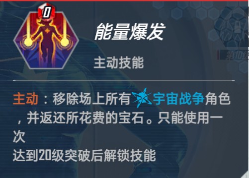 主动技能,不消耗宝石。移除场上所有宇宙战争角色,并返还花费的宝石。只能使用一次。