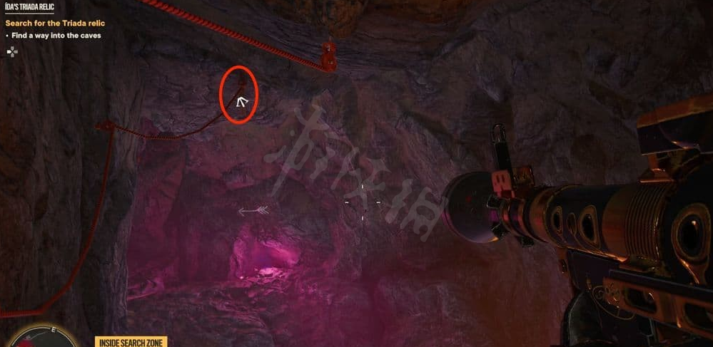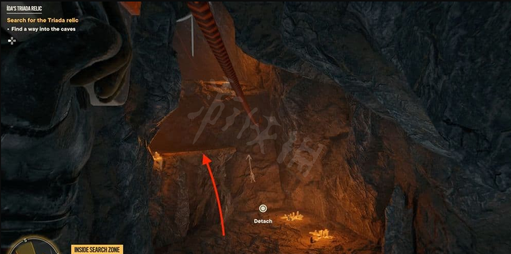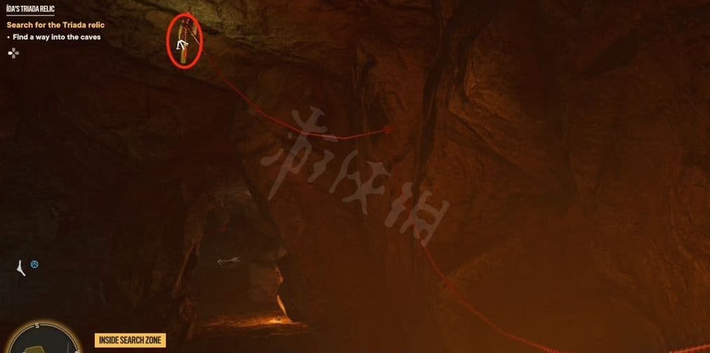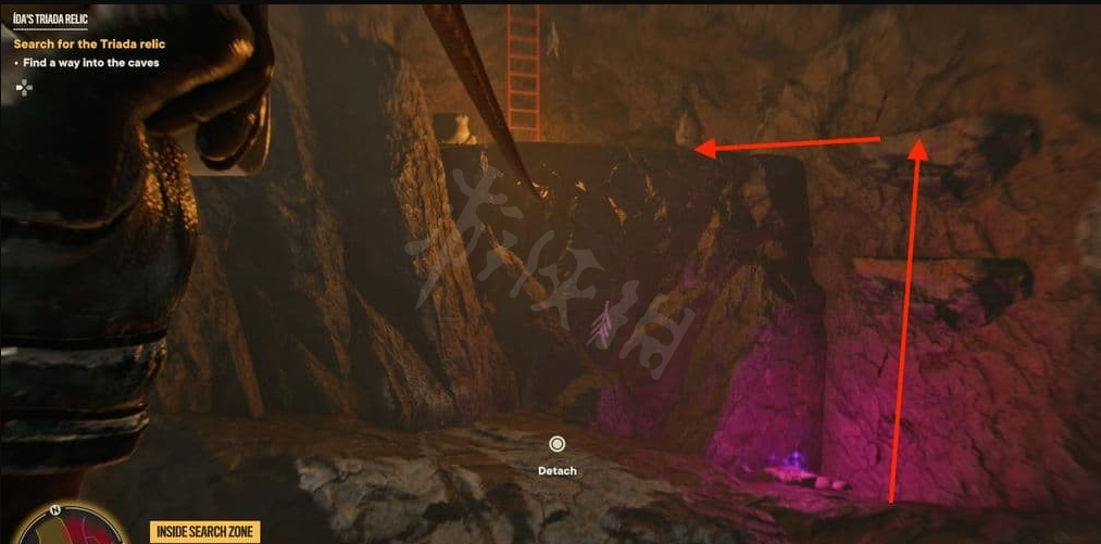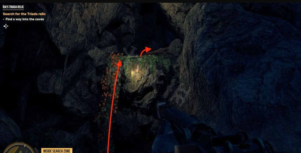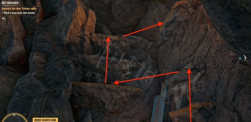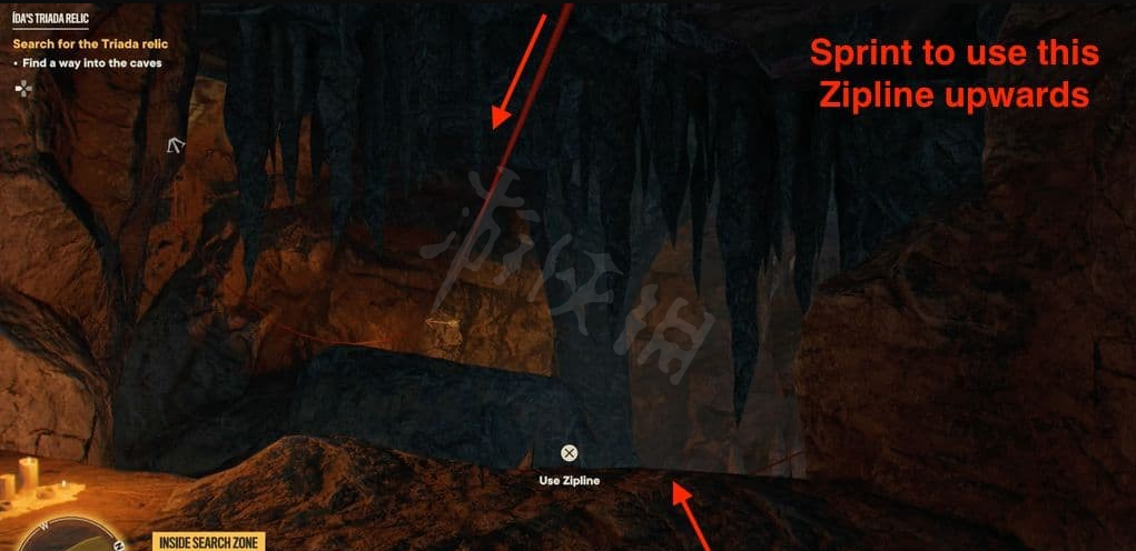 前往洞穴位置,然后沿着钩索点和藤蔓往上爬。