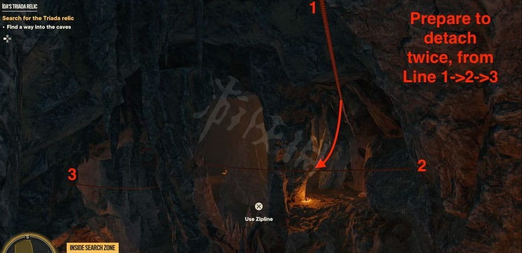 参考下方图片,使用滑索然后抓住时机按【○键】跳到另一条滑索上,到达第二条滑索的尽头,爬上岩石。