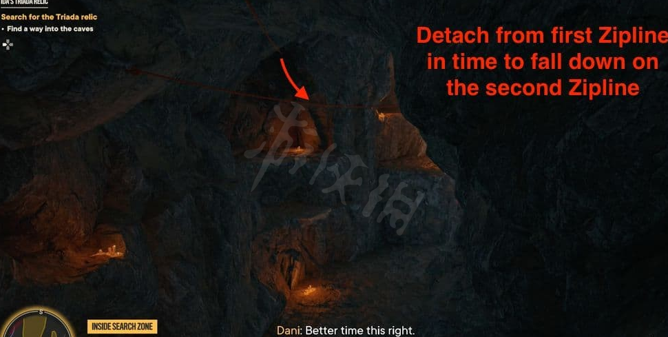 这里需要冲刺到边缘借助惯性沿着滑索上坡,然后再利用钩索点荡到另一侧。