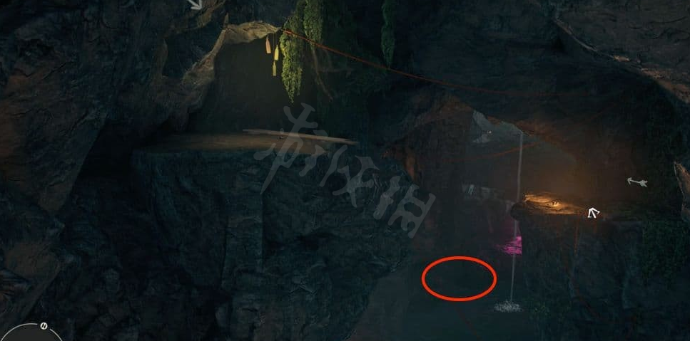 再经过一些藤蔓后,利用钩索点往下跳到洞穴中。