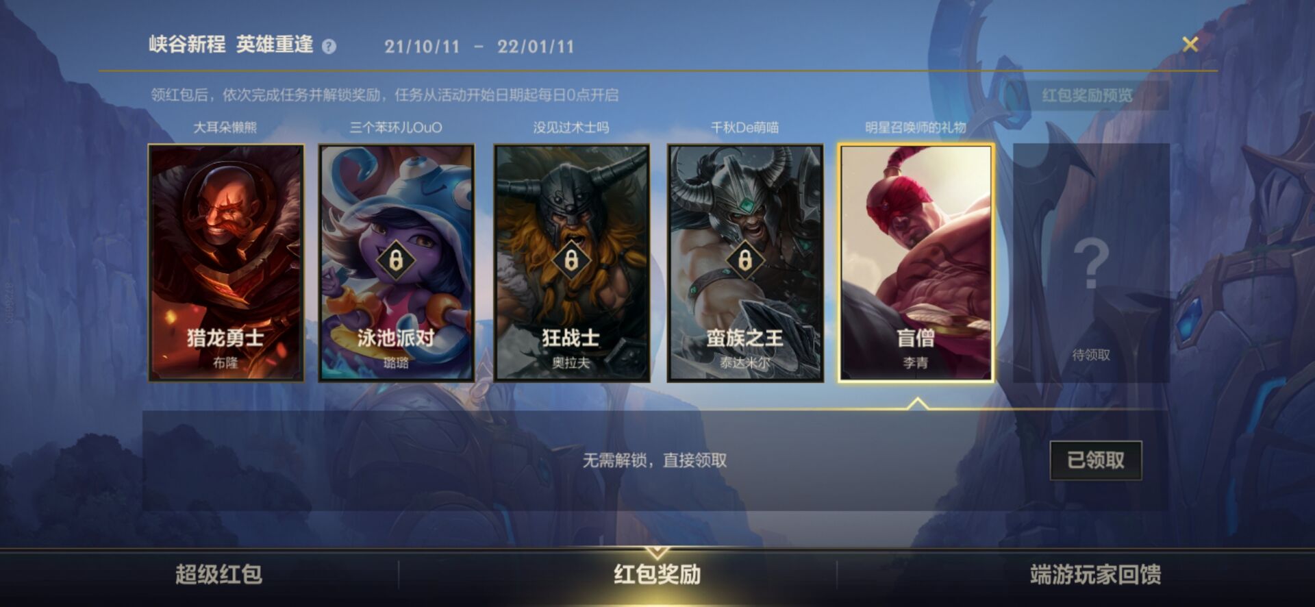 峡谷新程活动中的红包奖励只能领6个,到达上限后就无法领取了。