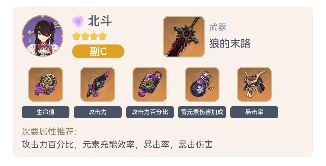 圣遗物首选【绝缘四件套】,由于北斗没有像满命行秋那样的能量回复手段,二雷二宗室未必有绝缘4好,按实际情况选择,雷伤杯。