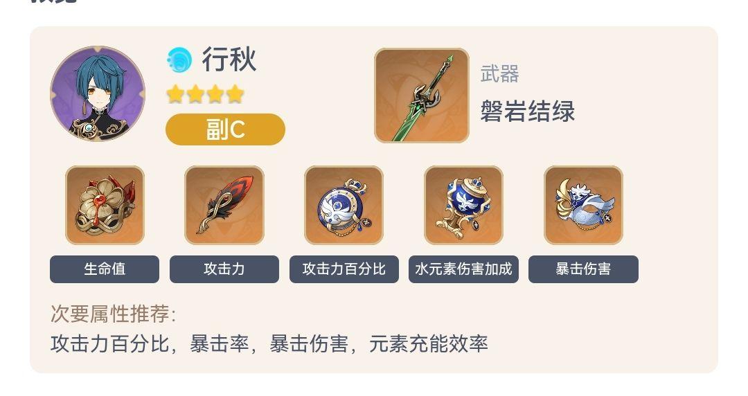 圣遗物首选【绝缘四件套】,因为行秋的元素战技同样有不俗的伤害,二水二宗室也是不错的选择,按需求选择充能沙或者攻击沙(深渊12层实战仅需150左右充能就做到无限续航),水伤杯。