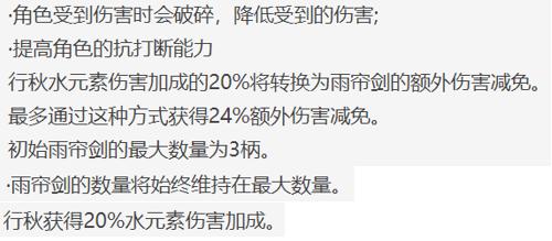 行秋在大招期间会提高抗打断能力,并全程获得伤害减免,减伤比例基础最高29%,理论总共29%+(46.6+15+20)*20%=45.32%,非常恐怖。雨帘剑碎裂或者结束可以为场上角色回复最少24%生命值。