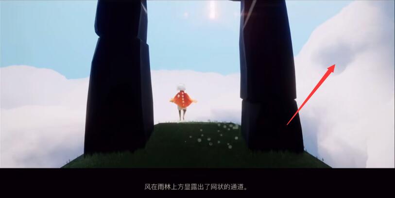 2、站在跳台上之后可以看到右上角有一个小豁口,雨林上方显露出了网状的通道,这里就是风行季地图的入口了;