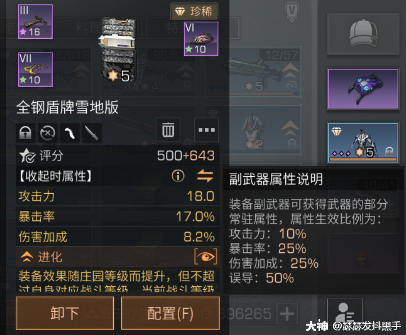 3.关于副武器的配件也很重要,需要去观察副武器的攻击力,比如144攻击力的马刀(盾牌),这时会四舍五入为140的10%为你提供14攻击力给主武器。如果你放了一级的握柄上去,攻击力变为145,四舍五入就是150,则提供给主武器15攻击力。