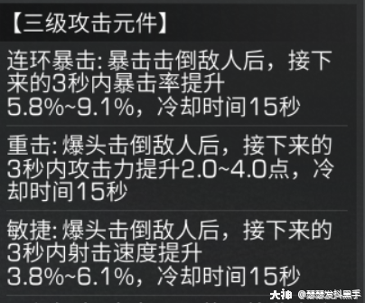 也可以自己搭配,由于继承关系,只能放攻击试剂去洗出暴击率,加上攻击或者无人机元件的特技,这里尽量注意副武器特技不要和主武器的特技重复。