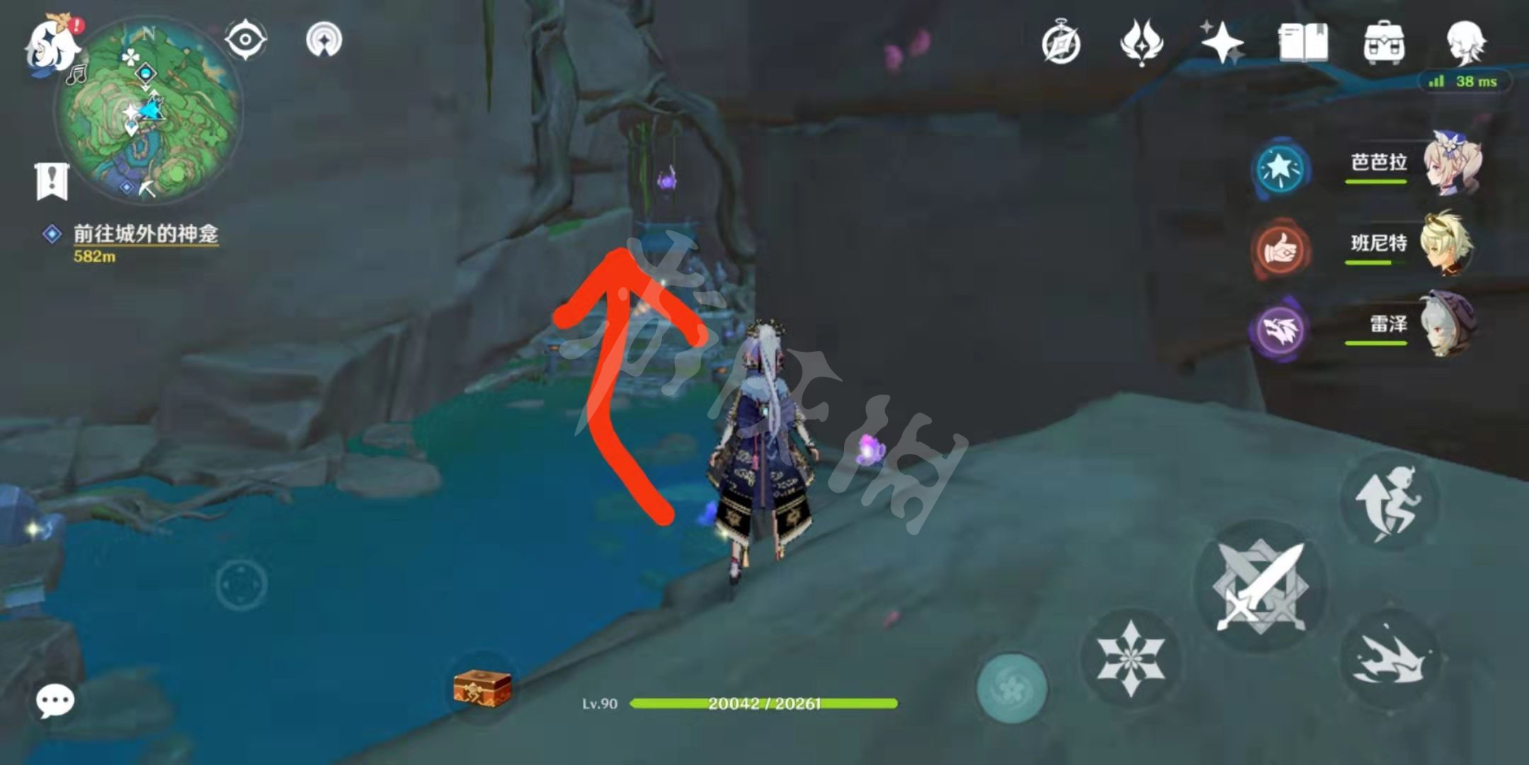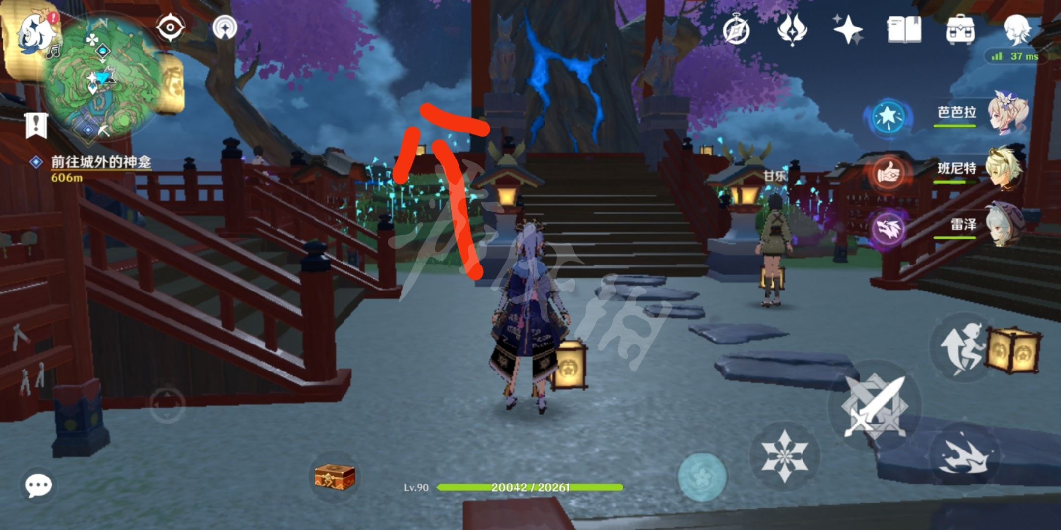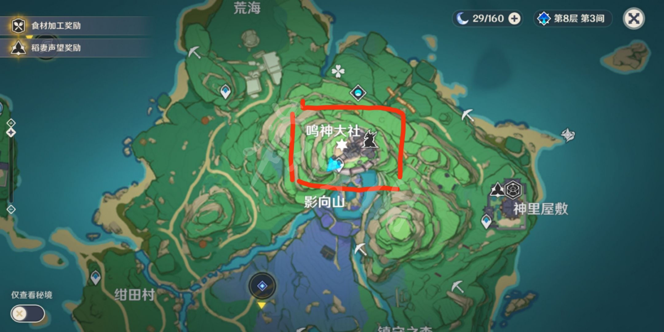 1.先传送到鸣神大社,然后走到神樱树前,然后按照下图箭头走到雷樱树左侧树脚的悬崖边。
