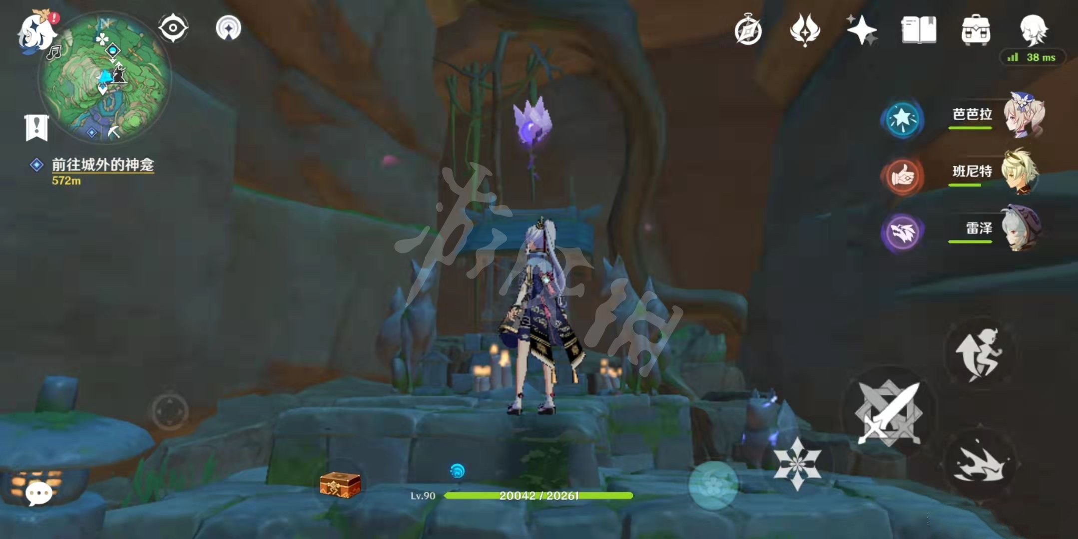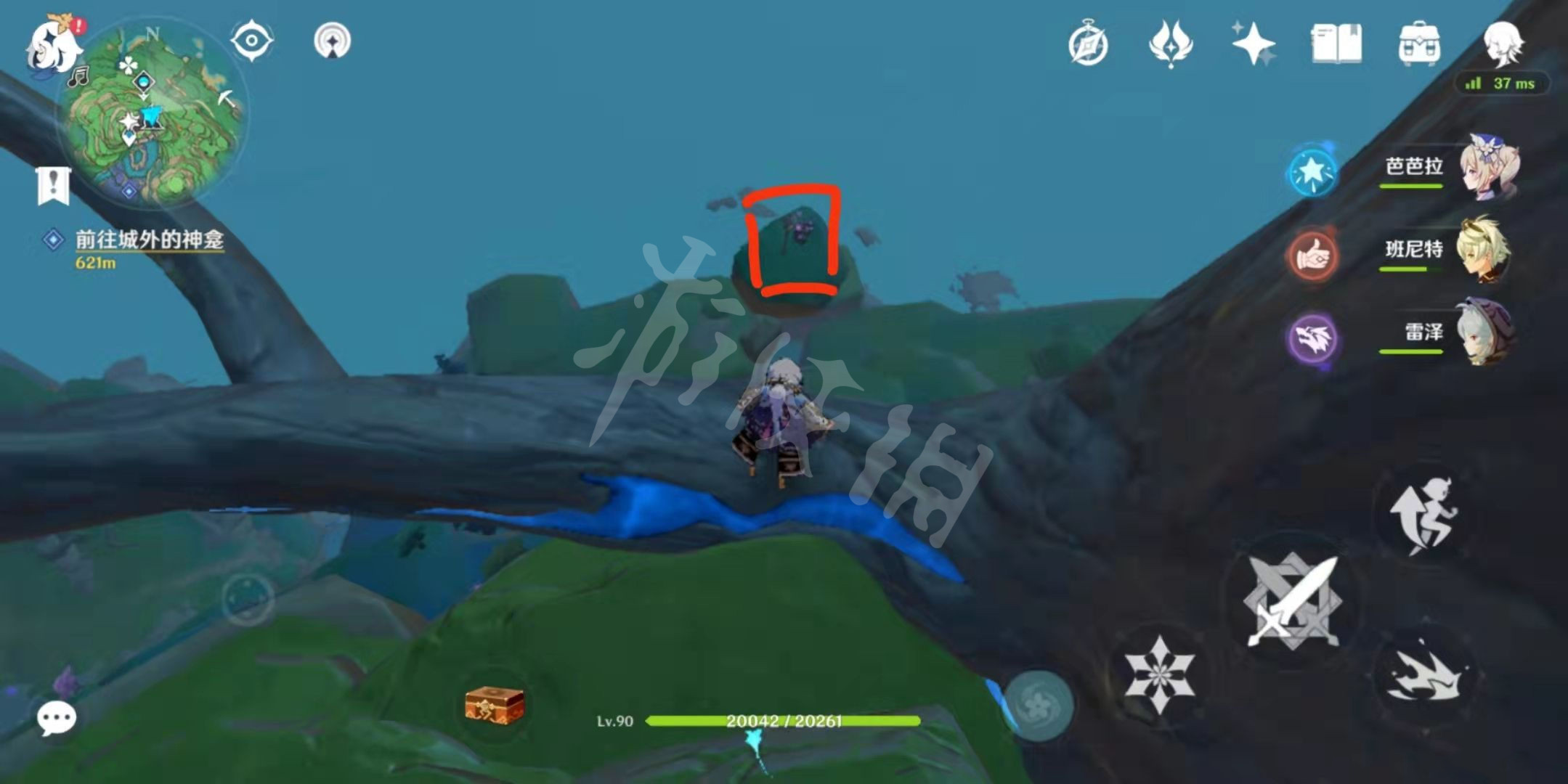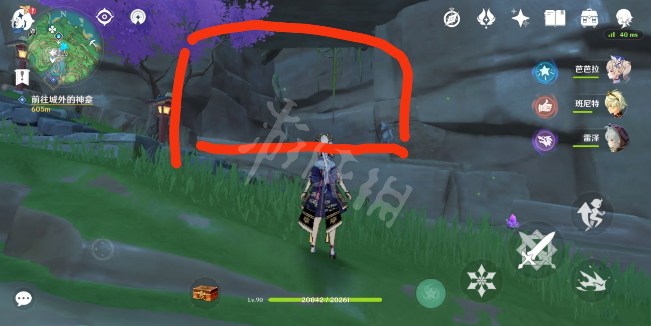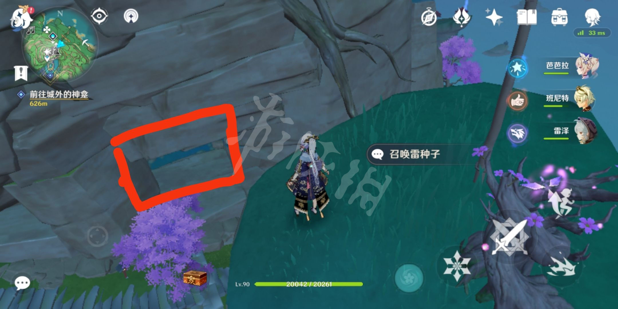 3.拿雷种子,然后把视角转到神樱树这边,然后就会看见下面我圈中的这个位置有个粉红色的结界门。