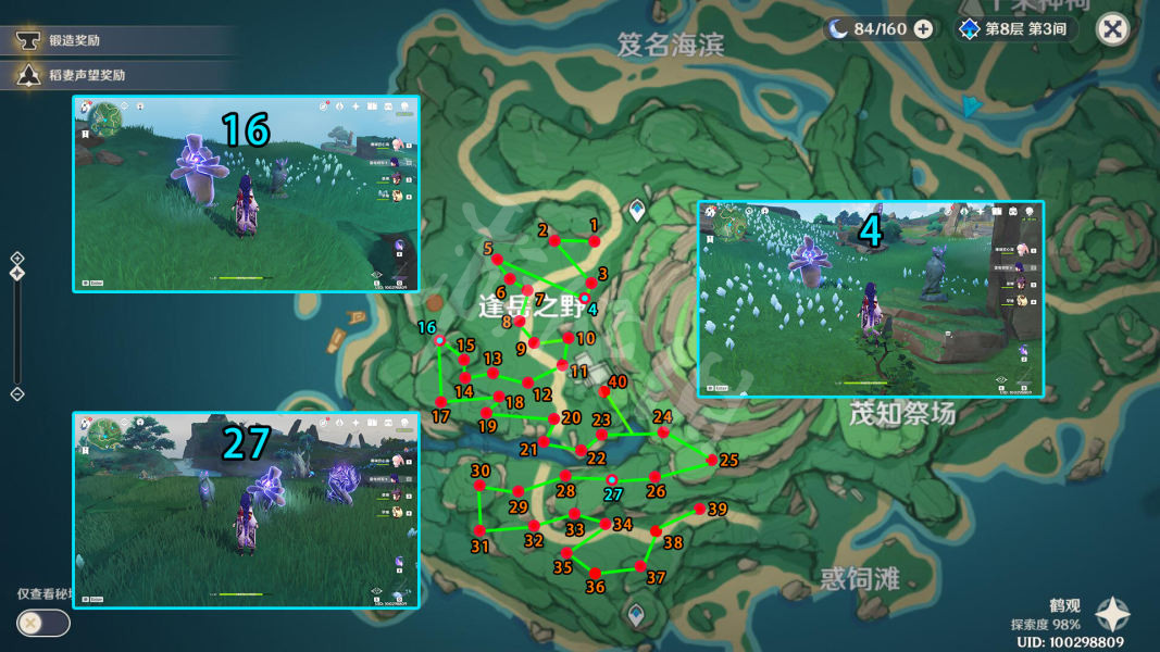 4、16、27号需要对着雷鸟雕像使用羽毛才会出现,其中4号处的雷鸟雕像需要完成鹤观主线第四天任务日轮与菅名山之后与4号附近的一个名叫知世的幻影对话后才能激活,否则此处无法交互。