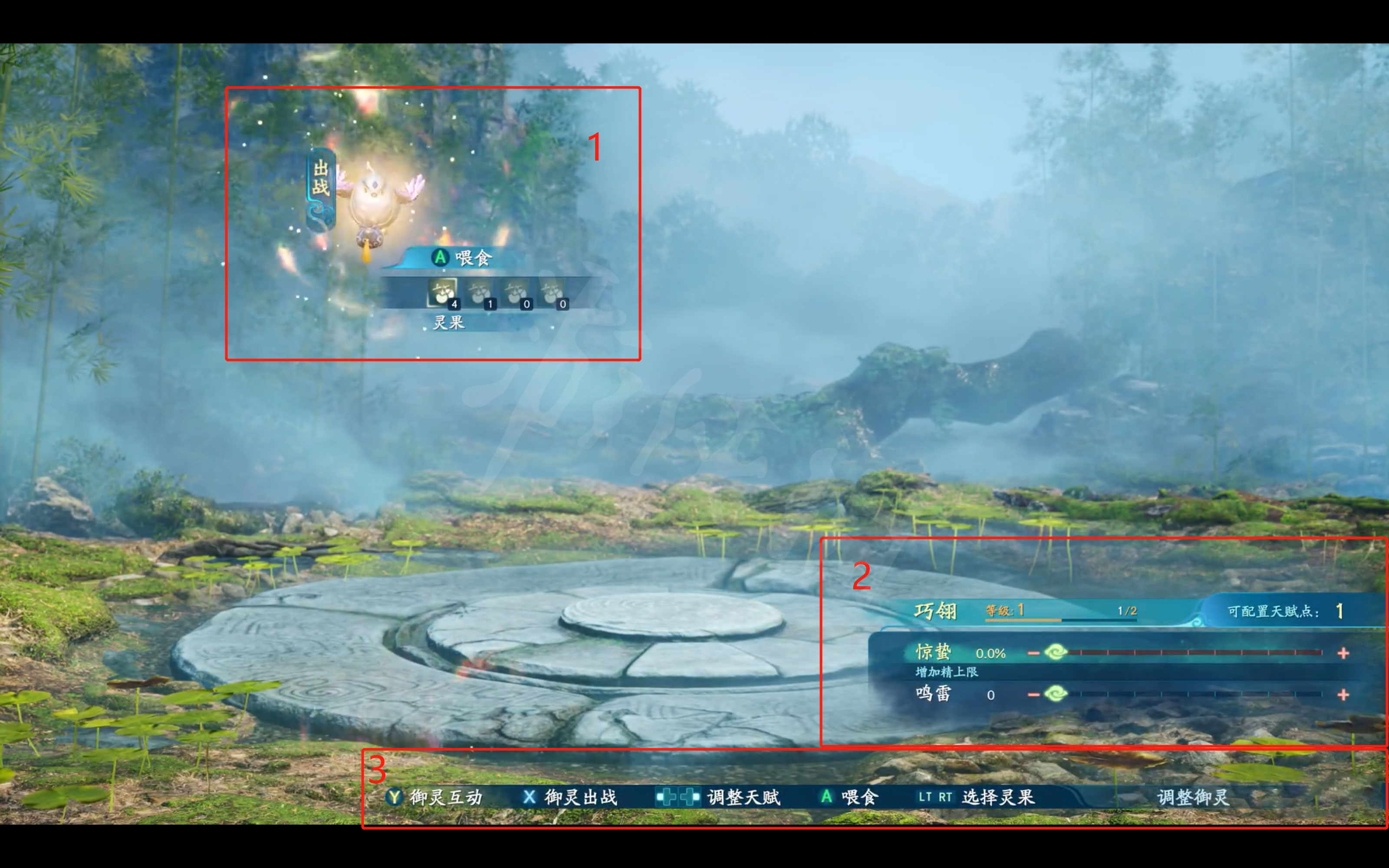 3代表御灵养成的操作提示:有御灵互动,御灵出战,调整天赋,喂食等功能,玩家需要利用好这些功能,好好用灵果培养御灵,御灵也会在战斗中协助玩家,是不可忽视的强大战力。