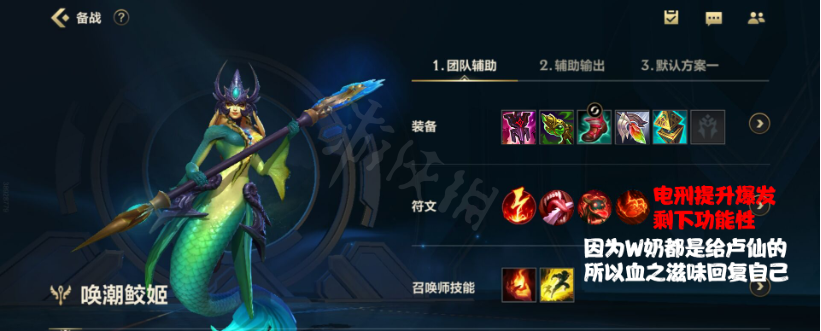 核心玩法就是娜美给卢仙套E ,然后卢仙E上去打个QAA,触发完电刑就可以撤退,爆发打完再继续打架就是吃亏的,基本一次换血敌人就掉半管,加上娜美回复能力,基本下路换血无敌手,一次换掉半管,为之后的击杀建立基础,缺点!!!Q和R真的很慢,需要一定熟练度。