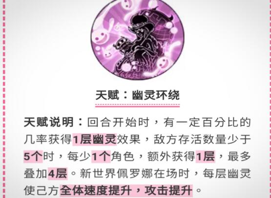 幽灵环绕:回合开始有一定几率获得1层幽灵效果,敌方存活少于5个时,每少1个,额外获得1层,最多4层。新佩罗娜在场时,每层使得己方全员速度、攻击提升。