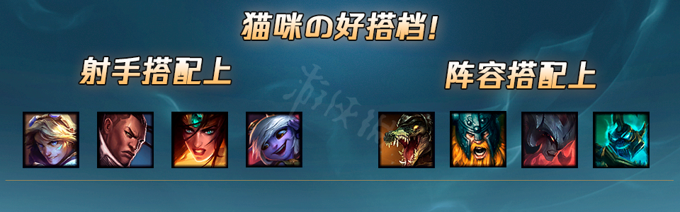 搭配禁忌:卡莉斯塔、薇恩、大嘴、老鼠、德莱文、女警。这些英雄与猫咪配合效果非常不好,很容易对线出问题。