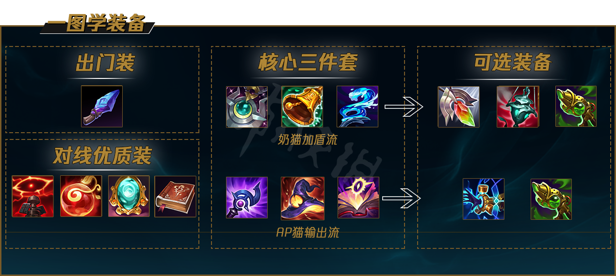 (2)莎弥拉、卡莎、霞,有较强的对拼能力。但猫咪无法帮助卡莎、莎弥拉触发被动,会影响一定的对线强度。后期团战可以配合他们大杀四方。流水法杖给卡莎+20技能急速的提升非常大。
