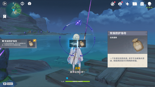 ⑵ 在逢岳之野左下角的小岛,对着雷鸟石雕,使用羽毛,出现钓鱼点,钓处任务道具【牧梨的护身符】即可。(白天、晚上鱼群各刷新一次!)