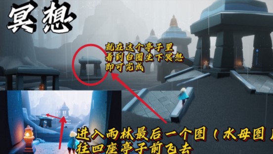 4、任务四:前往雨林的最后一张地图(即水母图),进入之后朝着四个亭子飞,其中一个亭子里面就是冥想点。