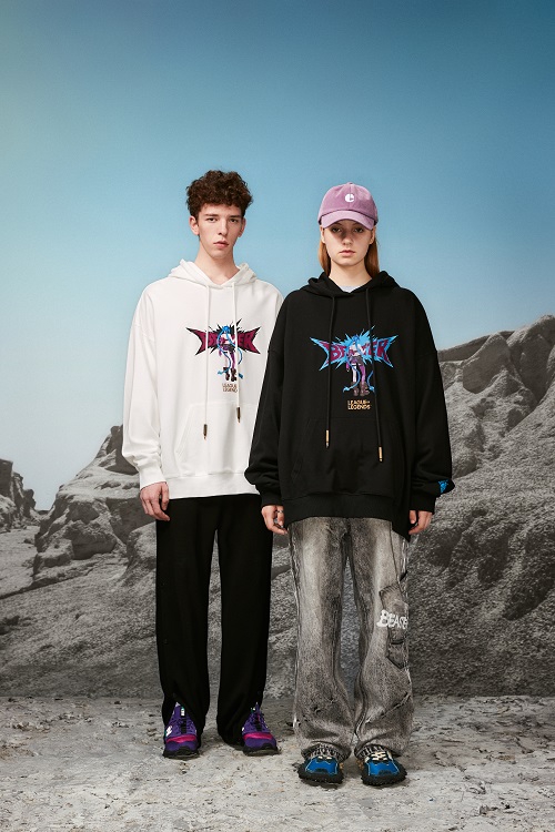 本次联名系列,将英雄联盟中的暴走萝莉金克丝、迅捷斥候提莫、疾风剑豪亚索等英雄作为主要元素融入设计当中,玩味有趣的二次元英雄人物与潮流风格齐聚一身,为消费者的秋日穿搭,赋予更多可能性。