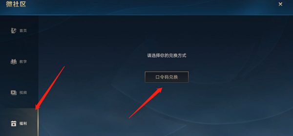 2、然后在微社区主界面,点击左下角的福利,就会出现口令码兑换按钮了,再次点击口令码兑换。