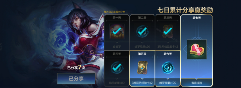规则:活动期间,召唤师完成7次每日分享,即可获得对应奖励