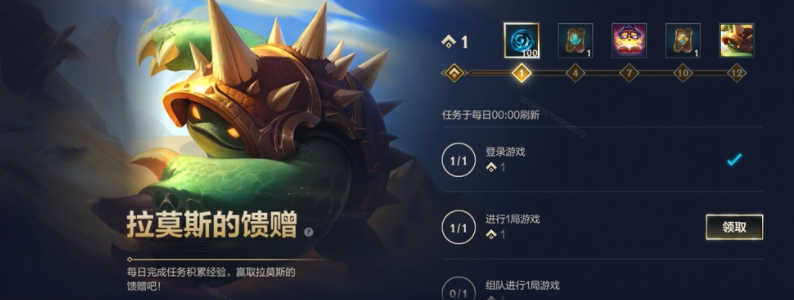 规则:召唤师完成每日任务,免费解锁永久英雄披甲龙龟-拉莫斯和更多奖励!