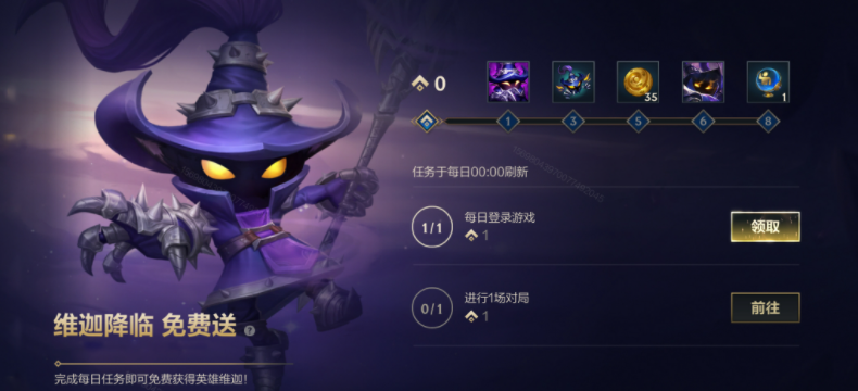 规则:召唤师只需完成每日登录、对局任务,即可免费获得邪恶小法师-维迦和其他奖励。