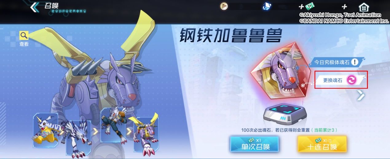 最后,歌子给队长们一个小建议~分子兽提供的魂石置换功能会有7天的冷却时间,在大家普通召唤的过程中,如果有自己心仪的究极体魂石需求,可以先点击【更换魂石】并消耗一定晶钻进行魂石更换,这样就不会浪费普通召唤券哦!