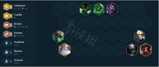 前期过渡体系我们可以选择炼金、老鼠、狼人以及青钢影,凑出3炼金科技以及2挑战者羁绊,炼金科技当炼金费卡生命值降低到一定值时,可以收益伤害减免以及攻速,而挑战者则是开局收益攻速,完成击杀后攻速可翻倍,两者搭配体系将输出系数拉满,可以稳定我们前期的运营节奏,保证一定的小连胜。