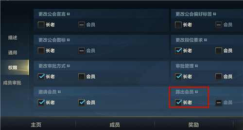 除了踢出成员的权限之外,公会长老还可以被会长赋予【更改公会宣言】、【更改公会图标】、【更改审批方式】、【更改公会偏好标签】、【更改段位要求】、【审批管理】这些权限,成为会长的左右手。