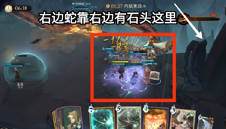 2、在开始时我习惯先打左右两边的,打左右两边的蛇可以站在最靠左边和右边里面的位置,这里甚至不会刷石头砸下来,而且基本只有一条蛇的怒吼吼中,如果在中间原地套盾套雾会被三头蛇集火攻击,还会被刷出来的石头砸中并且眩晕。