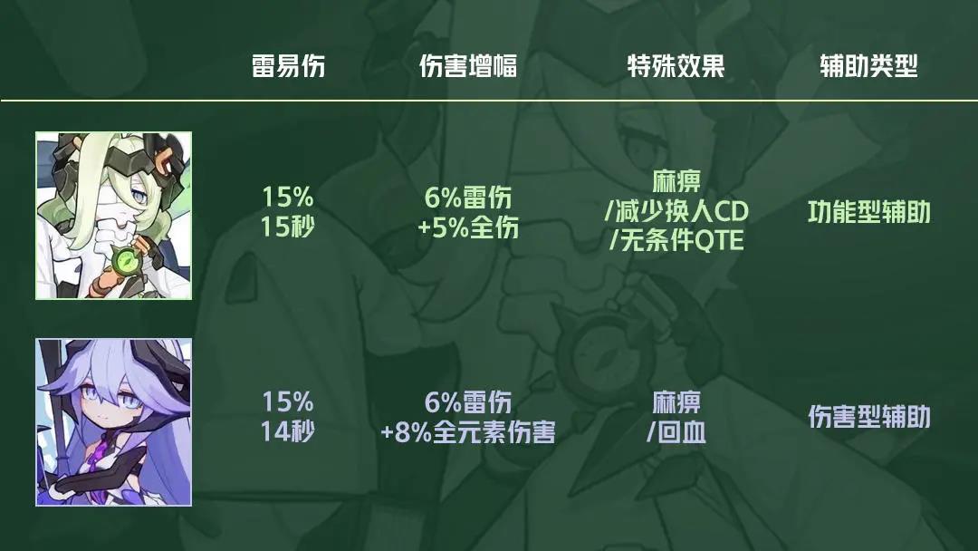 且值得注意的是,贝拉在解锁4星关键技能雷狱(延长敌人的雷易伤持续时间)之前,贝拉的辅助能力并没有同阶克莱茵优秀,到了4星时双方加伤效果才基本持平。贝拉相比于克莱茵的优势是自身的输出能力高一些,但功能性不如克莱茵。