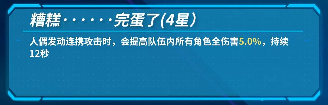 4星的加伤技能就较为微妙,它需要人偶发动连携攻击时才能触发。触发人偶连携技能需要三次计数,计数充能需要玩家使用分支攻击,人偶开局会自带两次计数,就是说开局只需要使用一次分支攻击即可触发这个技能。