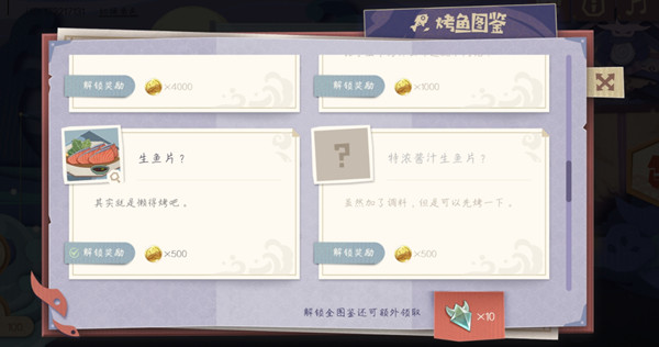 累计式大将好感度并解锁全部烤鱼图鉴可获得120原石、精锻用魔矿*12、大英雄的经验*6、摩拉*69500及晶核*10。