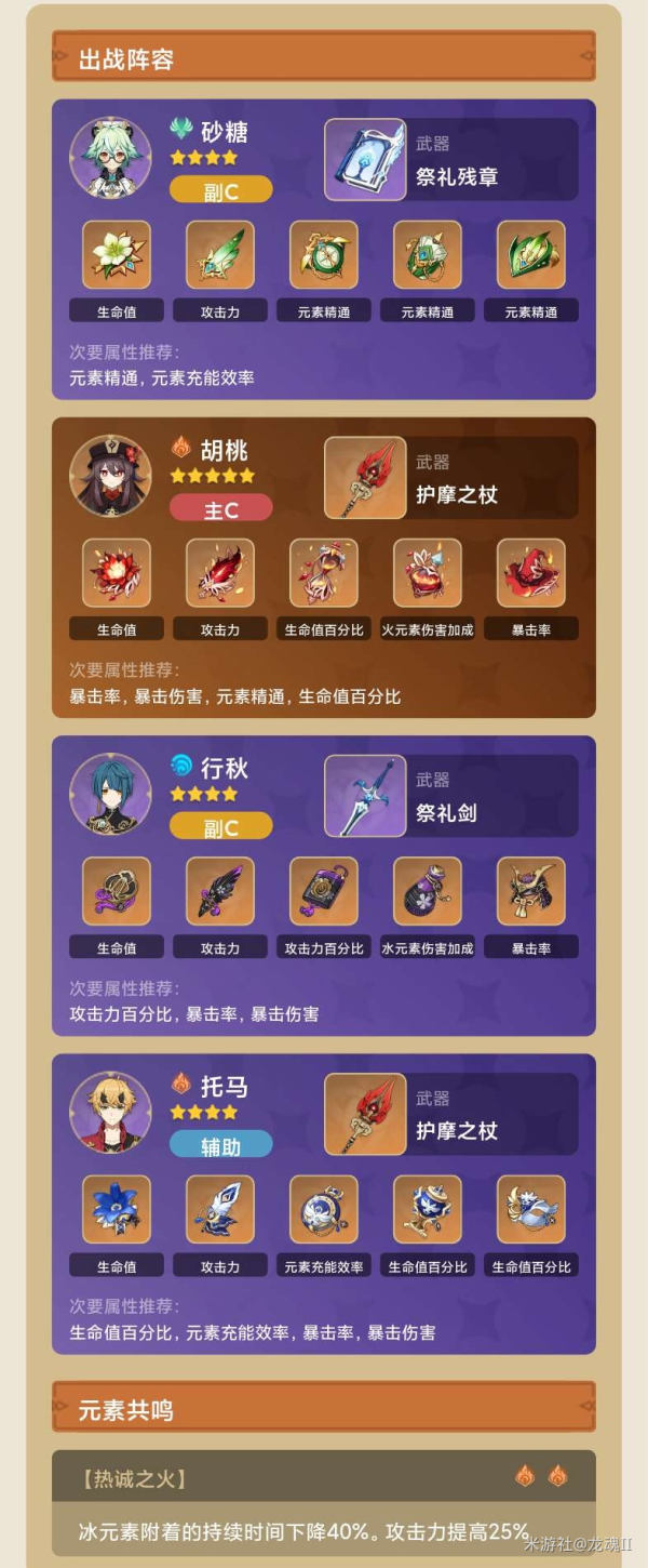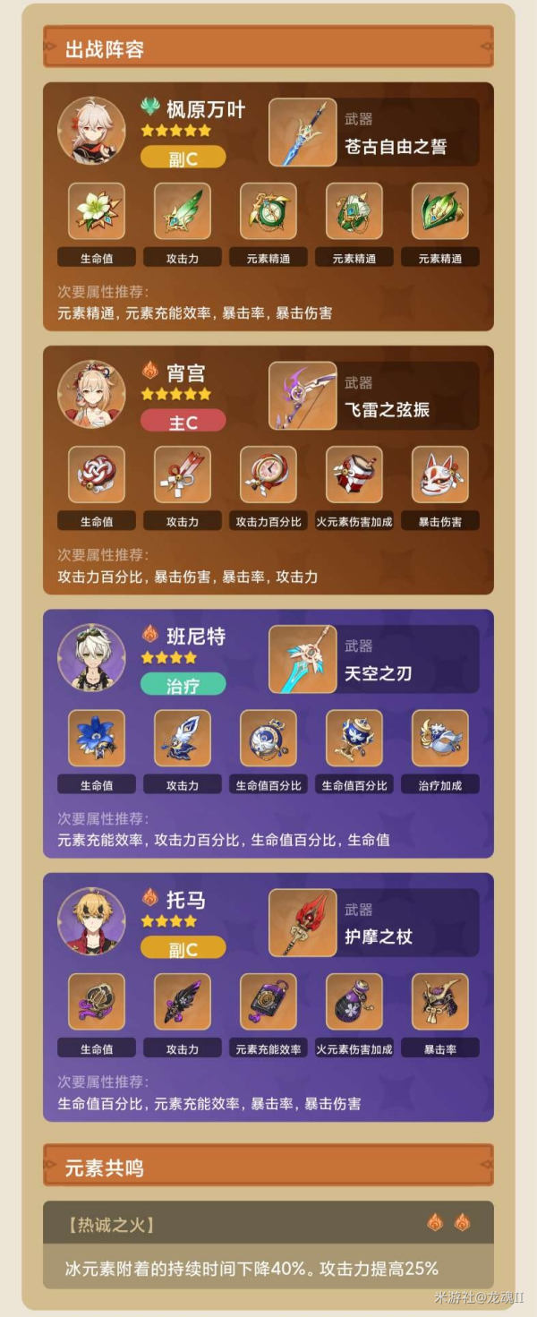 纯火的宵宫队,因为也没有反应,只需要减抗,所以在能发挥托马的护盾能力的同时也不浪费输出,而且因为是远程,所以抗打断效果也还好。