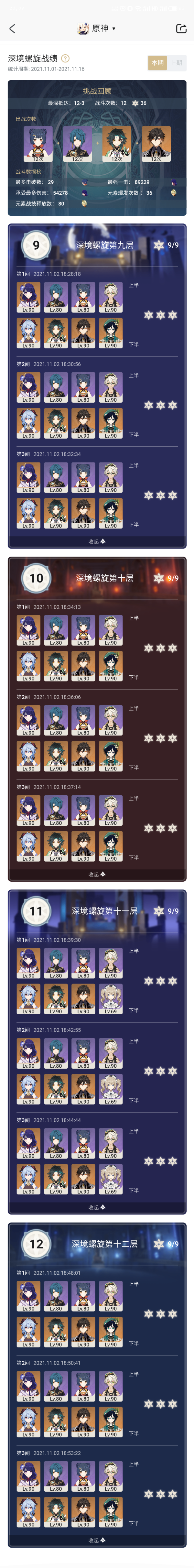 技巧:深境螺旋这几层的环境怪物分布都比较散,推荐加几个聚怪角色,一般为风系。如果没有的话需要靠走位拉怪或者高伤害秒杀来弥补没有拉怪带来的伤害分散。接着由于雷神国家队dps较高,所以没有感觉到怪物有多肉……真说肉的话还是剑鬼+下半的藏镜仕女。12层打怪先找小怪,大怪会自己跑过来。