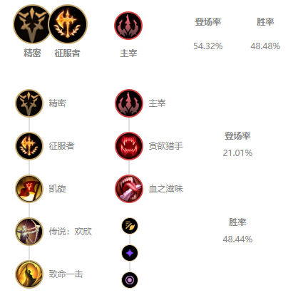 征服者能够让永恩有更强的持续输出作战能力。凯旋有着参与击杀回血的效果,欢欣增加攻速,致命一击提升斩杀伤害。主宰中的贪欲猎手和血之滋味都能够让永恩有不错的吸血,提升续航。