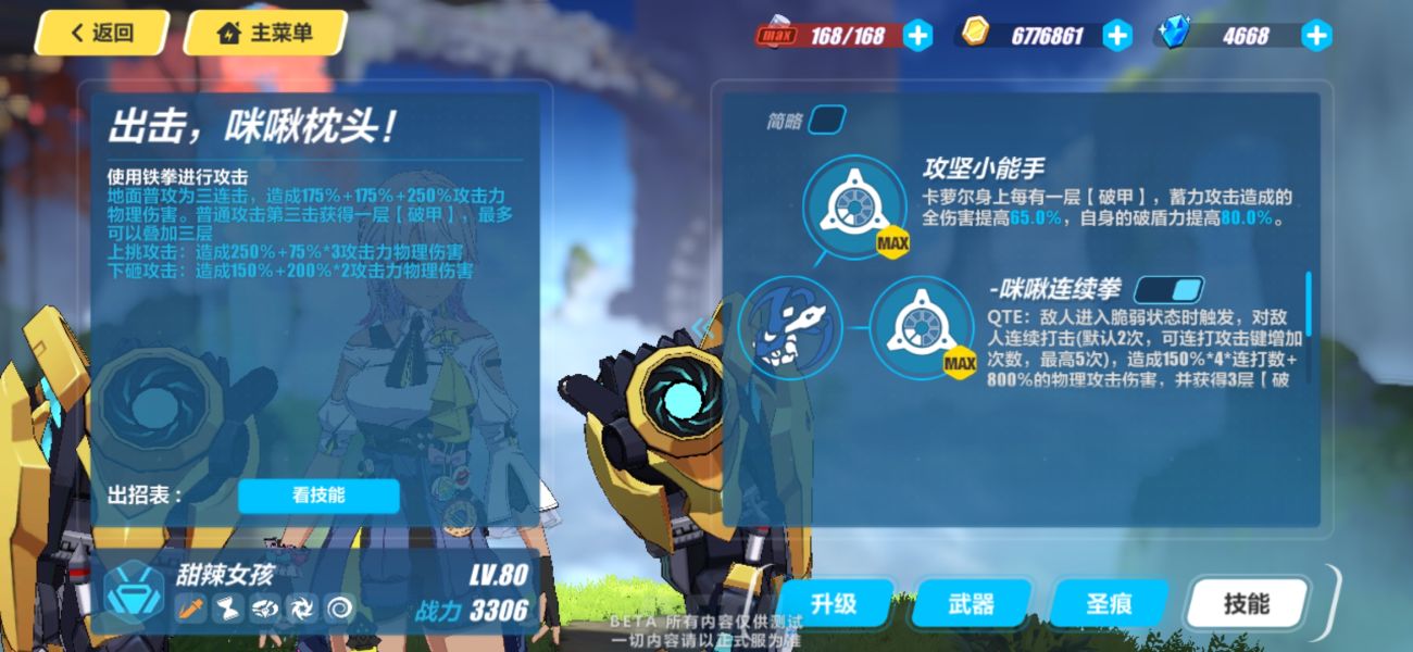 5.【超级卡罗尔状态】触发方式/效果:卡罗尔拥有3层【破甲】时任意蓄力命中敌人即可触发,重复触发刷新时间,触发后提升破盾能力,但会消耗3层【破甲】,若不满3层则不会消耗。