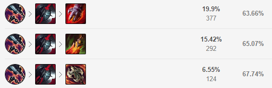 渴血战斧是锐雯的首选神话装备,增加伤害,生命值,技能急速和生命恢复效果,主动释放造成伤害并获得生命值,大大提升锐雯的持续作战能力,黑切增加伤害,生命值和技能急速,有利于打对线,再加上血手三件装备具备后团战能力更强,后续装备选择炼金朋克链锯剑+贪欲九头蛇。