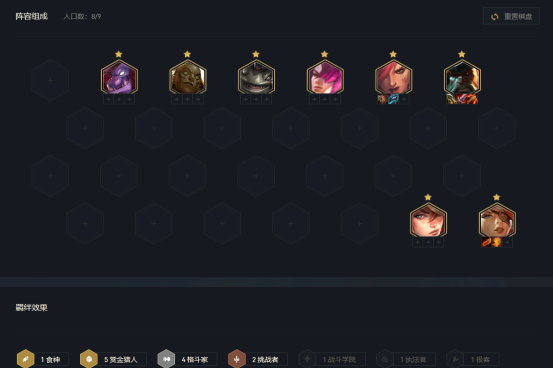 如果有海克斯强化羁绊,这套在7级就能成型,既能吃赏金的奖励,也能稳住强度少掉血。如果没有海克斯强化,那么拆掉永恩,用螃蟹做副C,顺便凑出2枪手羁绊。螃蟹副C的强度当然比奎因更高,主要是4费螃蟹出场比较晚而已。
